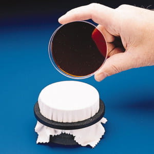 The replicator stamp enables the transfer of bacterial or yeast colonies from one culture medium plate to another. To duplicate the colony plates, fix one of the sterile tissues on the stamp with the aluminium ring. Then press the top side of the colony plate gently onto velvety surface of the stamp. Use a new plate to produce the duplication.