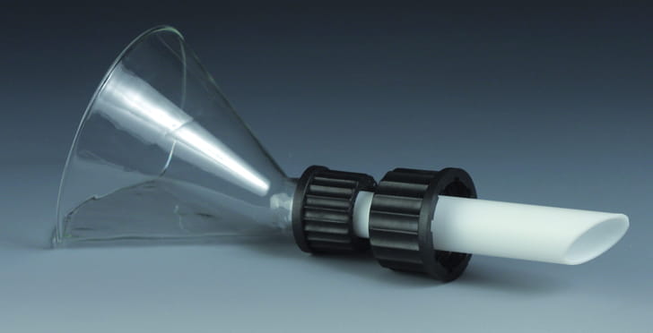 Lejek o poj. ~100 ml ze szkla brokrzemianowego, rurka wlotowa wykonana z PTFE, w dolnej części połączenie ze szlifem.