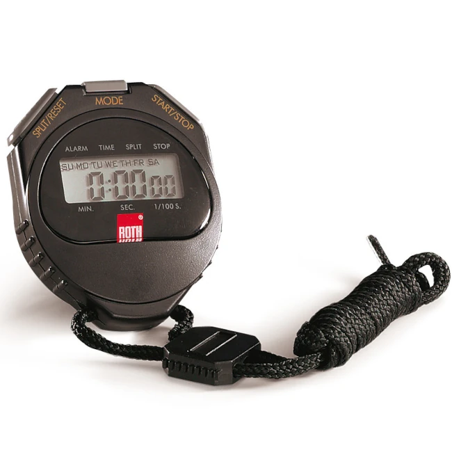 Bryzgoszczelny. Czas pomiaru 24 h. Przez 30 min wyświetla 1/100 s. Odczyt międzyczasów. Dodatkowo z zegarem, kalendarzem i alarmem. Funkcja Snooze (drzemka). Wymiary: wys. 69 mm x szer. 59 mm x gł. 19 mm.